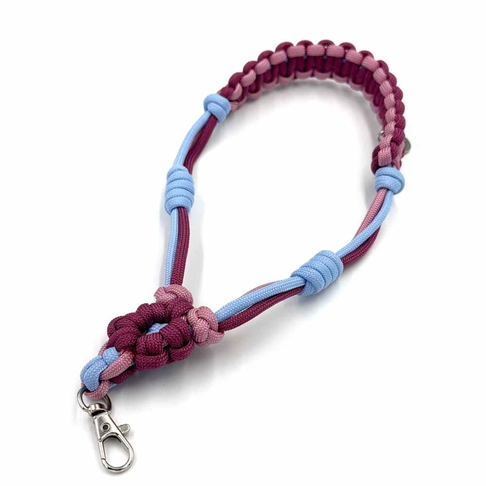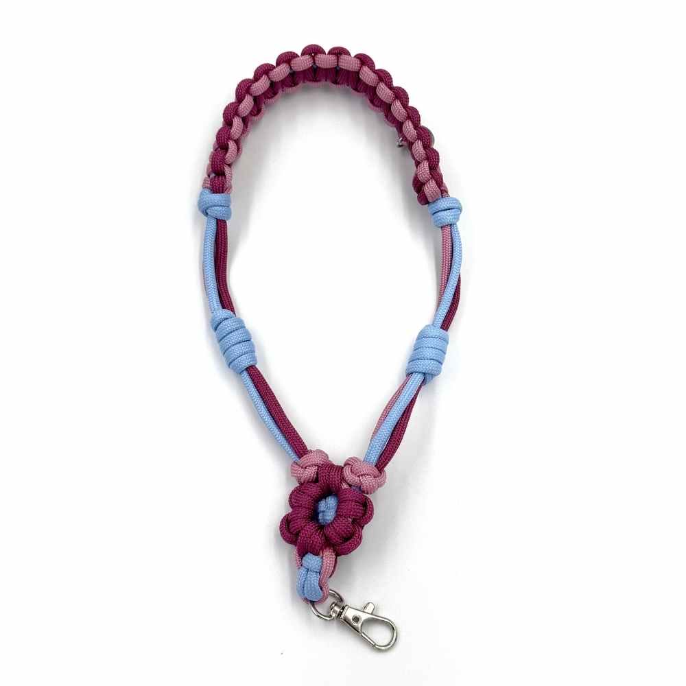 Stylowa i funkcjonalna smycz do telefonu, która doda wygody i uroku Twoim codziennym akcesoriom. Wykonana z wytrzymałej linki paracord w odcieniach niebieskiego i różowego, z ozdobnym oplotem i plecionym kwiatkiem – idealna dla osób ceniących oryginalny design.