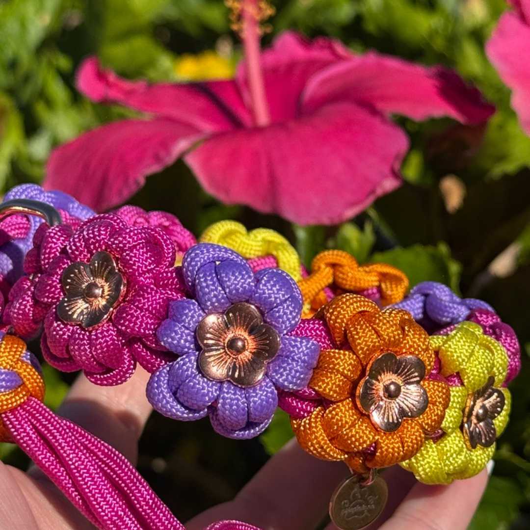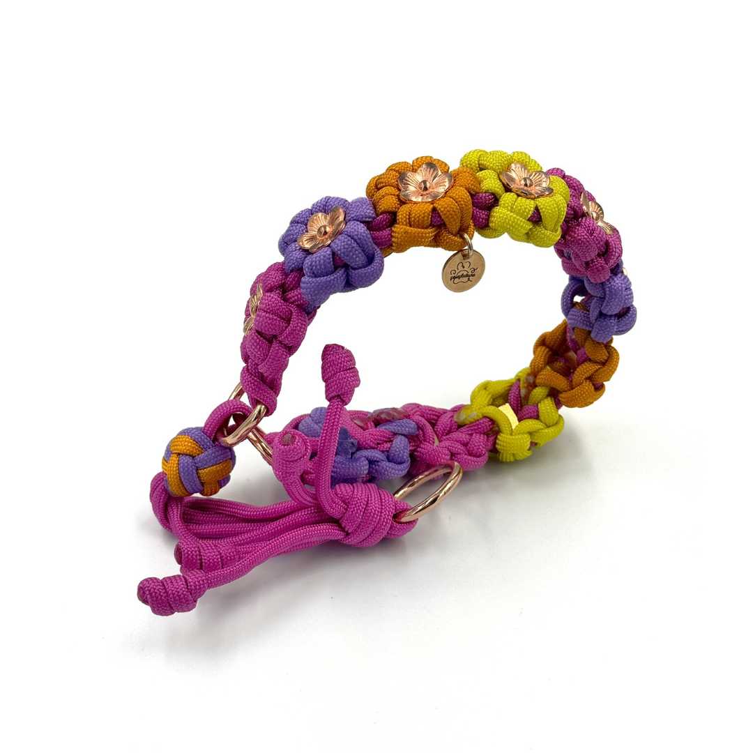 Kwiatowy splot został wykonany z linki Paracord 550, która dzięki swojej wytrzymałości znajduje zastosowanie, m.in. w akcesoriach survivalowych. Wybierając nasze obroże możesz mieć pewność, że utrzymają największego psiego siłacza.