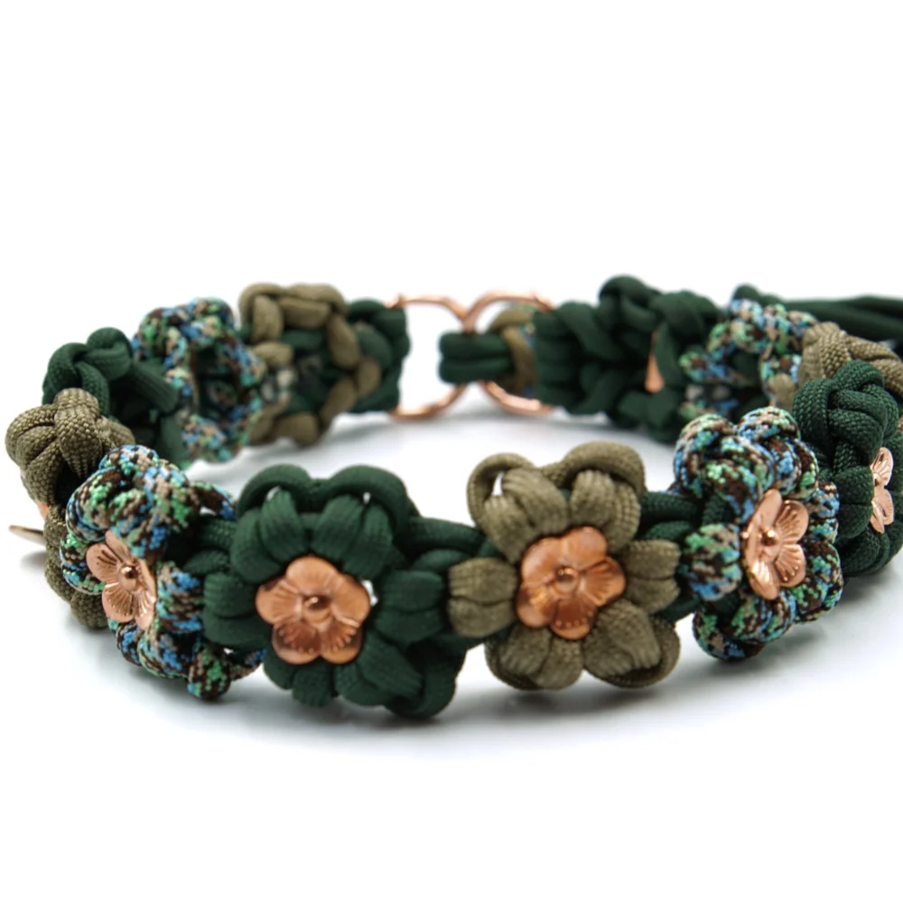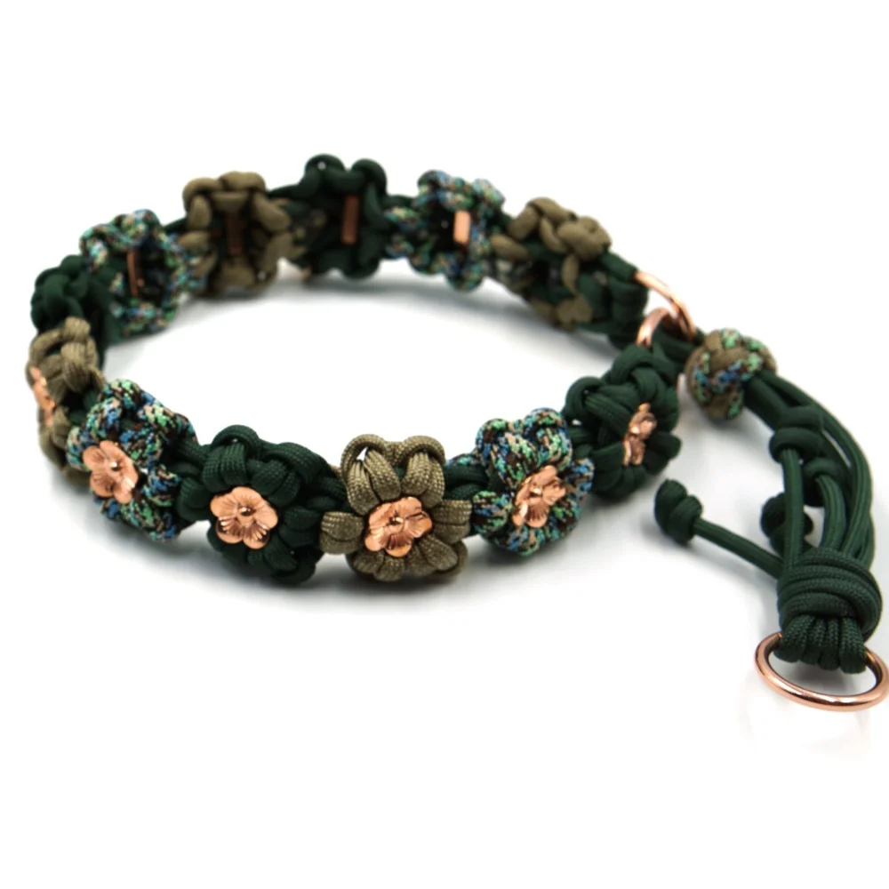 Kwiatowy splot został wykonany z linki Paracord 550, która dzięki swojej wytrzymałości znajduje zastosowanie, m.in. w akcesoriach survivalowych. Wybierając nasze obroże możesz mieć pewność, że utrzymają największego psiego siłacza.