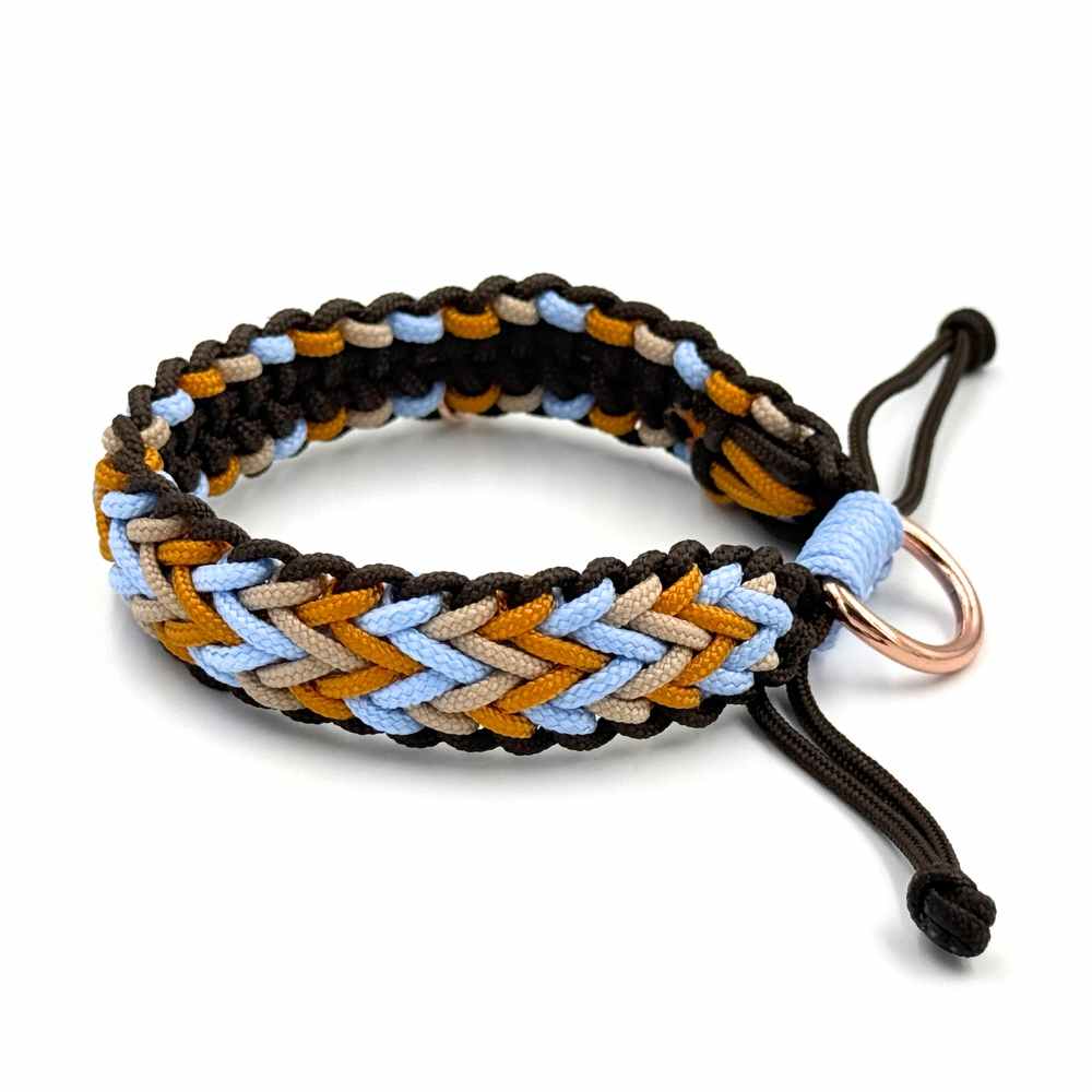- Zacisk z regulacją – ozdobny supeł zaciskowy umocowany na dodatkowej pętelce pozwala na regulację obwodu obroży, aby idealnie dopasować ją do szyi psa.