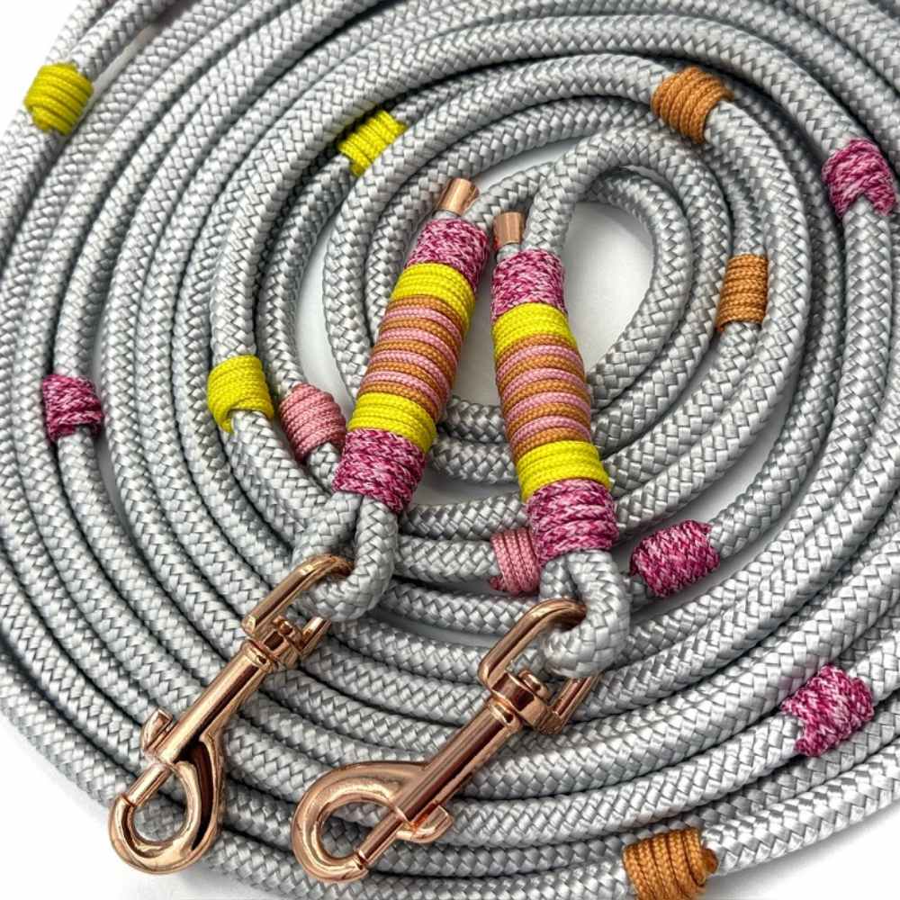 Smycz przepinana – po obu stronach zakończona karabińczykiem, kółka do przepięć umieściliśmy na węzłach, dzięki czemu można samodzielnie modyfikować długość smyczy, w zależności od potrzeb. Smycz przepinana świetnie sprawdzi się na spacerach, podczas których pozwalamy psu eksplorować otoczenie, chcemy aby miał odpowiednią przestrzeń do obwąchiwania i zwiedzania wszystkich zakamarków. Najchętniej wybieraną przez Was długością są 3 metry, ale możemy wykonać smycz z liny o różnej długości – zdecyduj, którą wybierasz i zaznacz odpowiednią opcję w konfiguratorze.