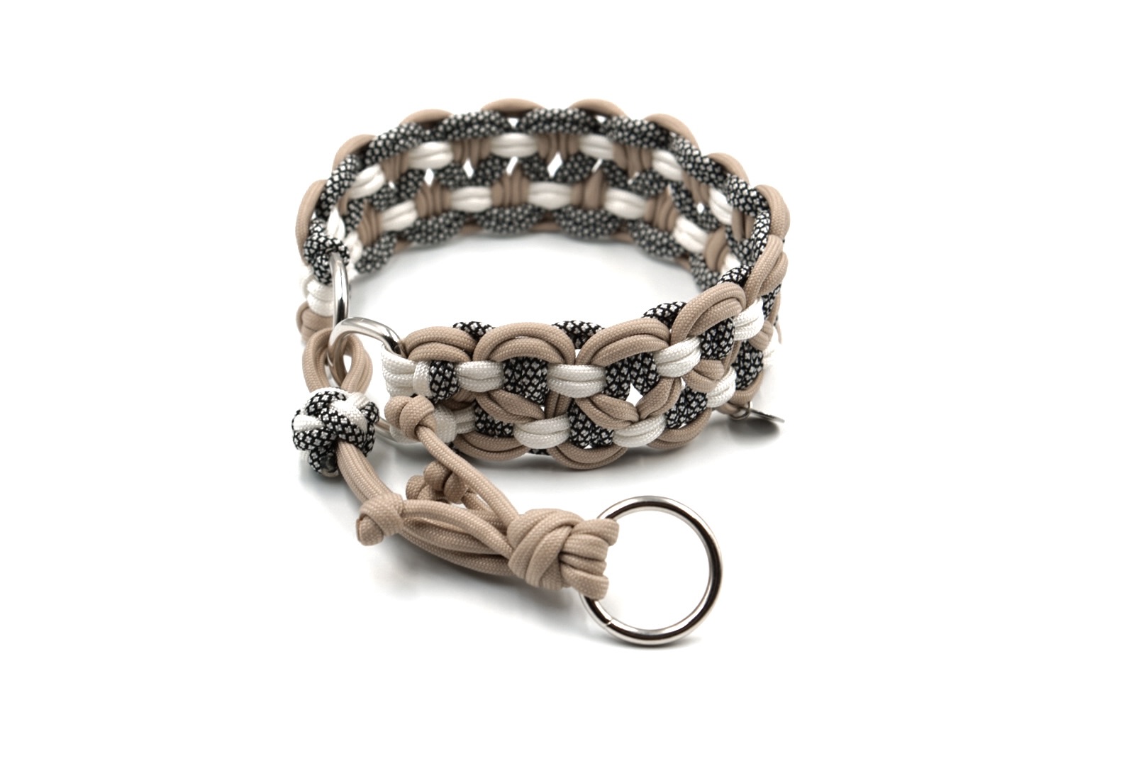 Zacisk z regulacją – ozdobny supeł zaciskowy umocowany na dodatkowej pętelce pozwala na regulację obwodu obroży, aby idealnie dopasować ją do szyi psa.