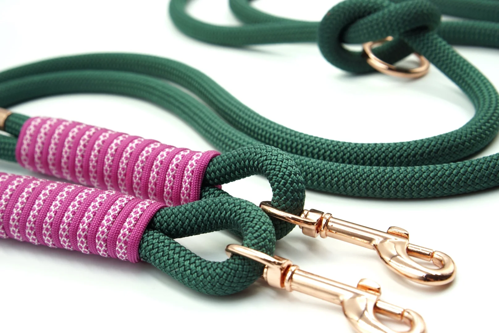 Smycz w hitowym kolorze butelkowej zieleni z fantazyjnym różowym oplotem.